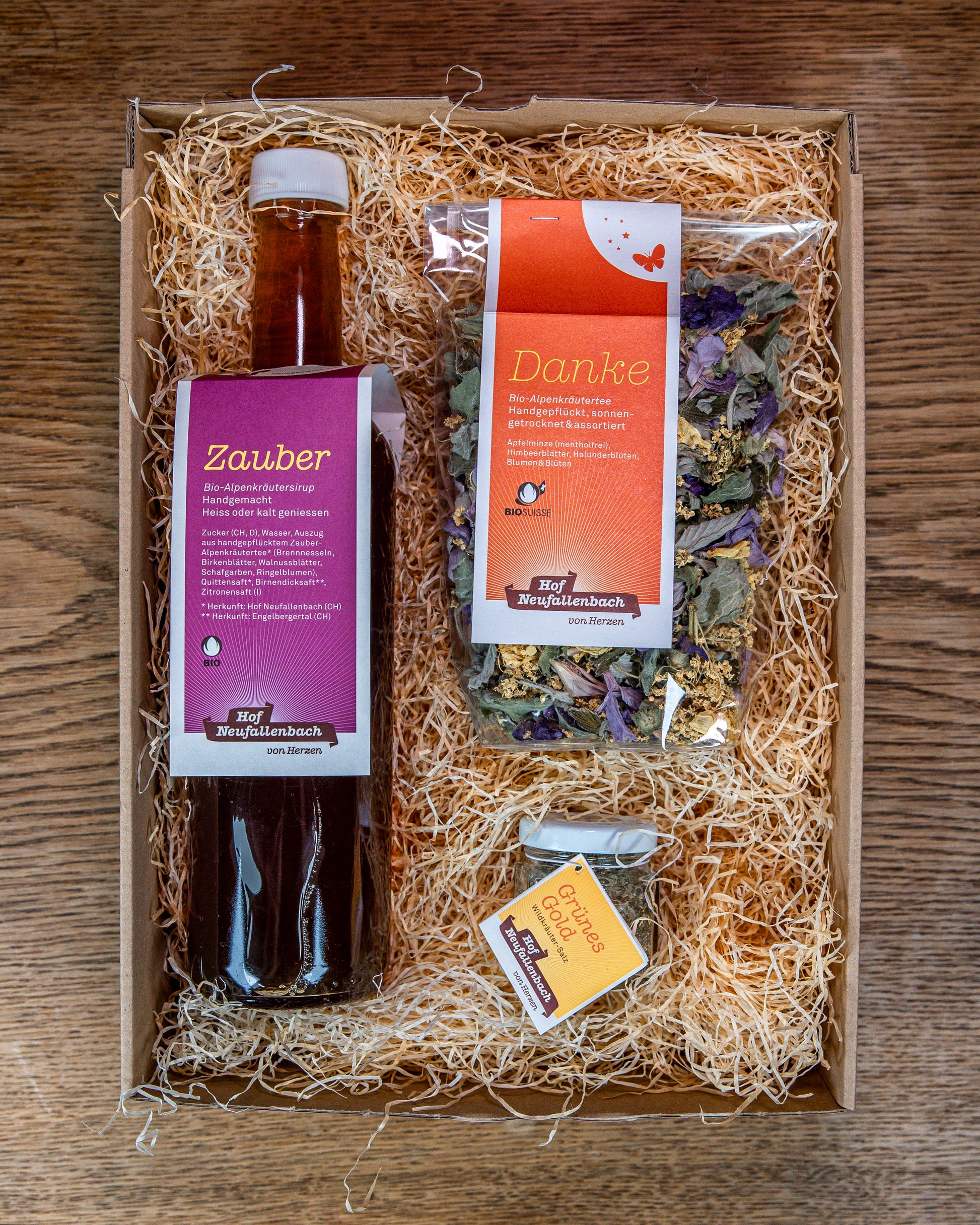 Drei liebevoll abgestimmte Naturprodukte bringen Freude in jeden Alltag: Der Alpenkräutertee «Danke» mit feiner Apfelminze und einem Hauch Holunderblüte lädt zu einem stillen Moment der Wertschätzung ein. Der Zaubersirup aus ausgewählten Kräutern schenkt dem Tag einen Hauch Leichtigkeit und verwandelt jedes Glas in einen kleinen Genussmoment. Das Wildkräutersalz «Grünes Gold» rundet das Set ab – eine aromatische Mischung aus kraftvollen Alpenkräutern, die jedes Gericht bereichert und an die Fülle der Natur erinnert.
